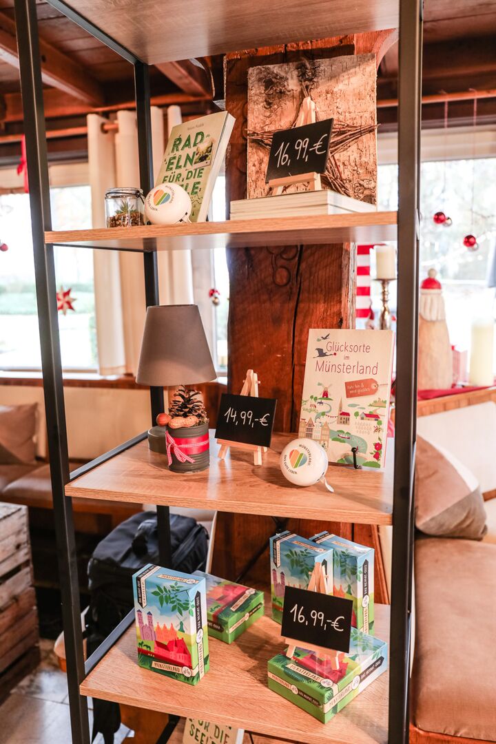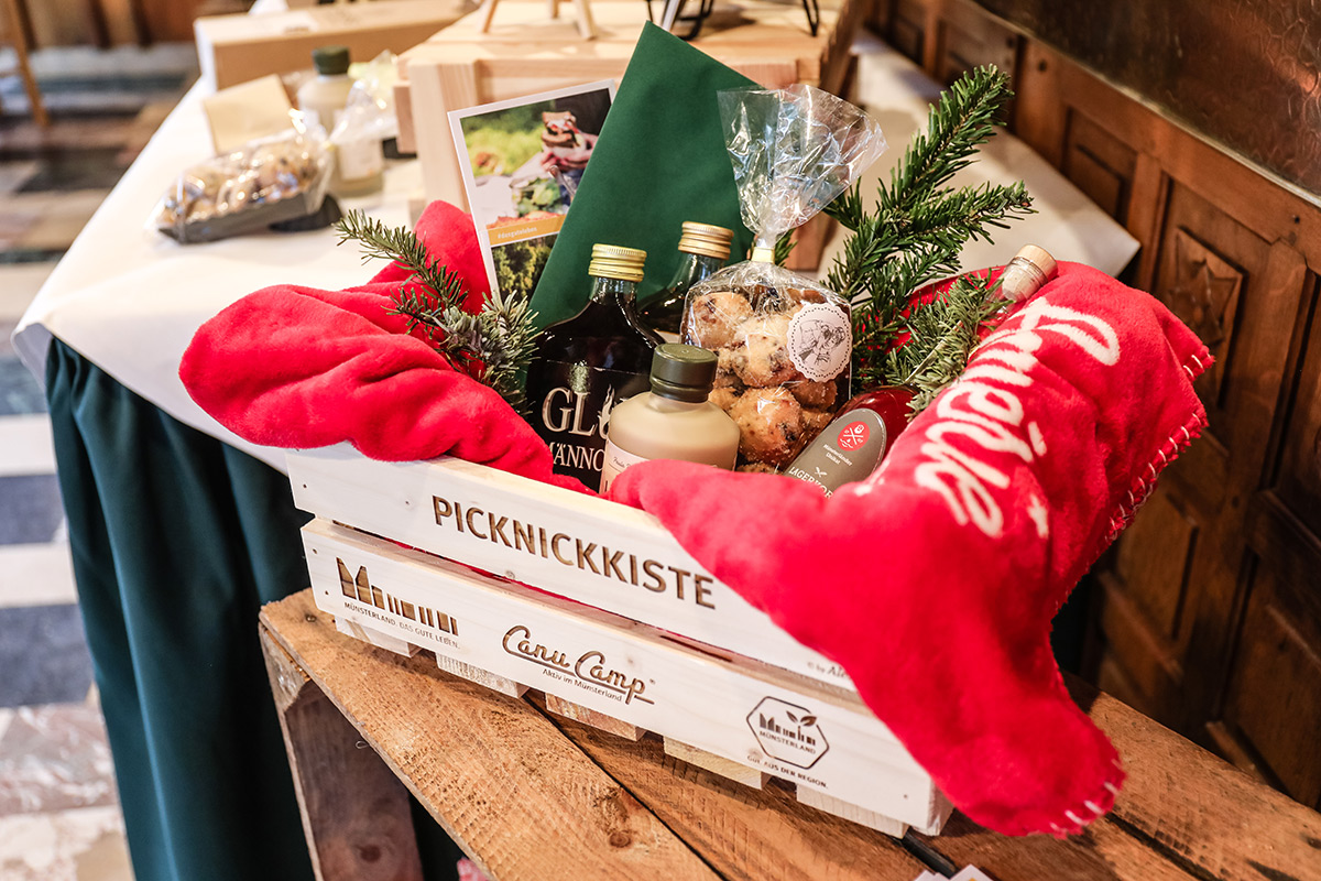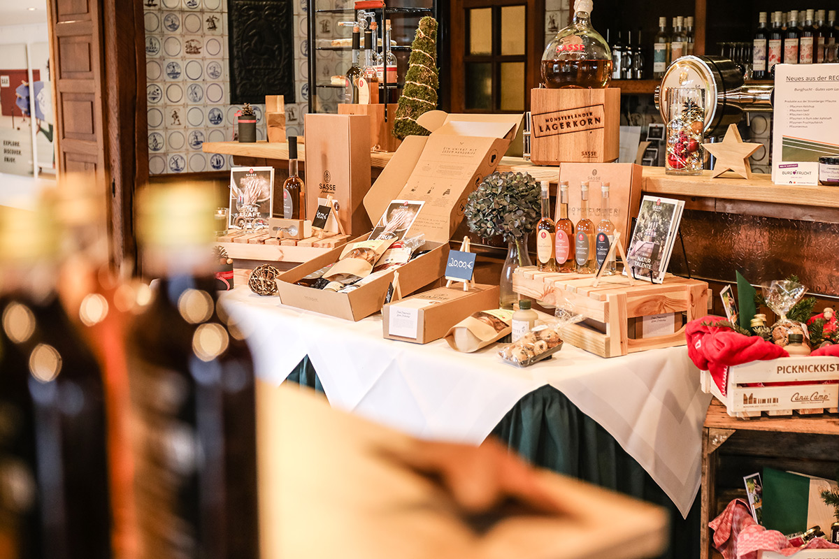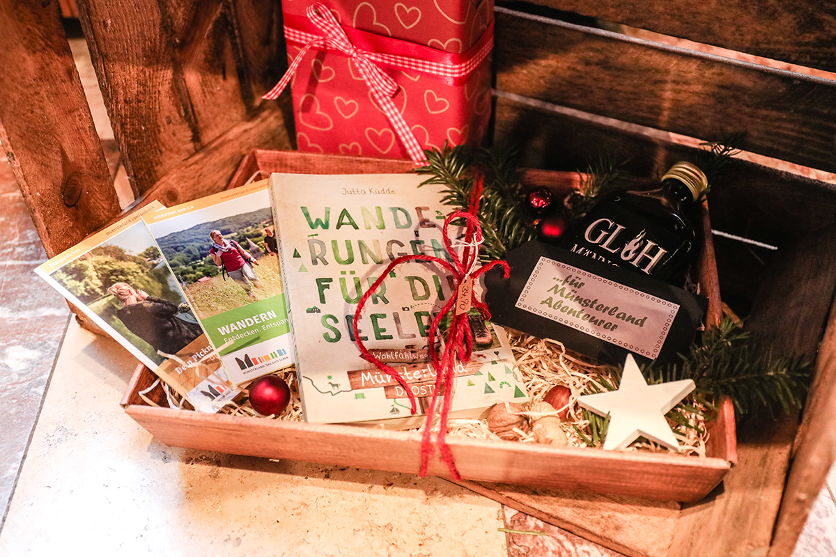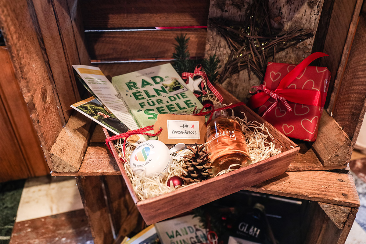 Der Münsterland-Shop oder wie wir ihn gerne nennen » #StrandHofladen «. Der ging natürlich pünktlich zur Vorweihnachtszeit mit allen regionalen Lieblingssachen an den Start. Unsere ländlich-rustikale Präsent-Holzkiste steht zum Befüllen bereit. Und natürliche jede Menge leckerer und nützlicher Input. Sie wählen, wir packen ein und verpacken. Hundertprozentiger können Sie das Münsterland nicht verschenken." Der Mensch liebt Anschaulichkeit, darum lassen wir uns ein paar Dinge vorführen. Die Genussexpertin Paula Pumpernickel hat die Münsterländische Herrencreme in ein fein balanciertes Likör-Getränk aus Schokolade, Vanille und Rum verwandelt. Sasse aus Schöppingen steuert seinen legendären Lagerkorn bei. Die Münstersche Marmeladenfaktur versüßt den Tag durch Feige, Birne, Portwein und andere niederknieenswerte Kompositionen. Vom Obsthof Korn liegen Apfelchips bei. Undsoweiter, sagen wir an dieser Stelle, denn der Appetit ist längst geweckt und die Liste wäre lang.