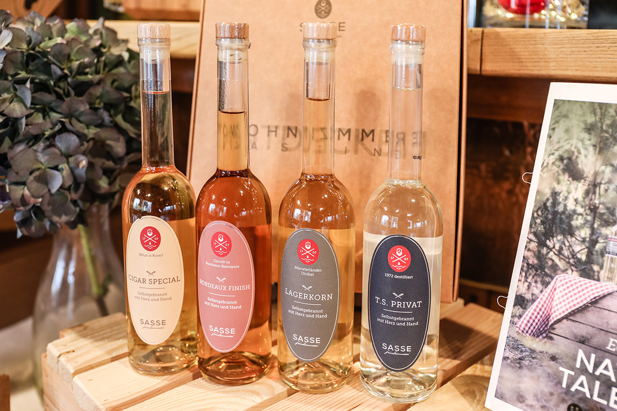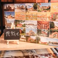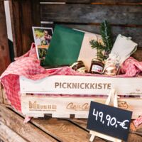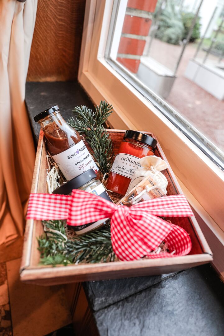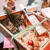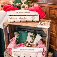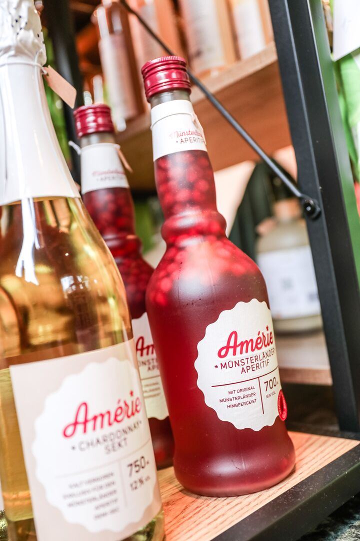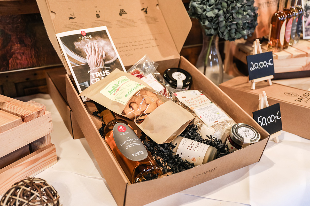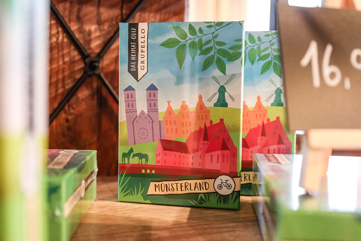 Der Münsterland-Shop oder wie wir ihn gerne nennen » #StrandHofladen «. Der ging natürlich pünktlich zur Vorweihnachtszeit mit allen regionalen Lieblingssachen an den Start. Unsere ländlich-rustikale Präsent-Holzkiste steht zum Befüllen bereit. Und natürliche jede Menge leckerer und nützlicher Input. Sie wählen, wir packen ein und verpacken. Hundertprozentiger können Sie das Münsterland nicht verschenken." Der Mensch liebt Anschaulichkeit, darum lassen wir uns ein paar Dinge vorführen. Die Genussexpertin Paula Pumpernickel hat die Münsterländische Herrencreme in ein fein balanciertes Likör-Getränk aus Schokolade, Vanille und Rum verwandelt. Sasse aus Schöppingen steuert seinen legendären Lagerkorn bei. Die Münstersche Marmeladenfaktur versüßt den Tag durch Feige, Birne, Portwein und andere niederknieenswerte Kompositionen. Vom Obsthof Korn liegen Apfelchips bei. Undsoweiter, sagen wir an dieser Stelle, denn der Appetit ist längst geweckt und die Liste wäre lang.