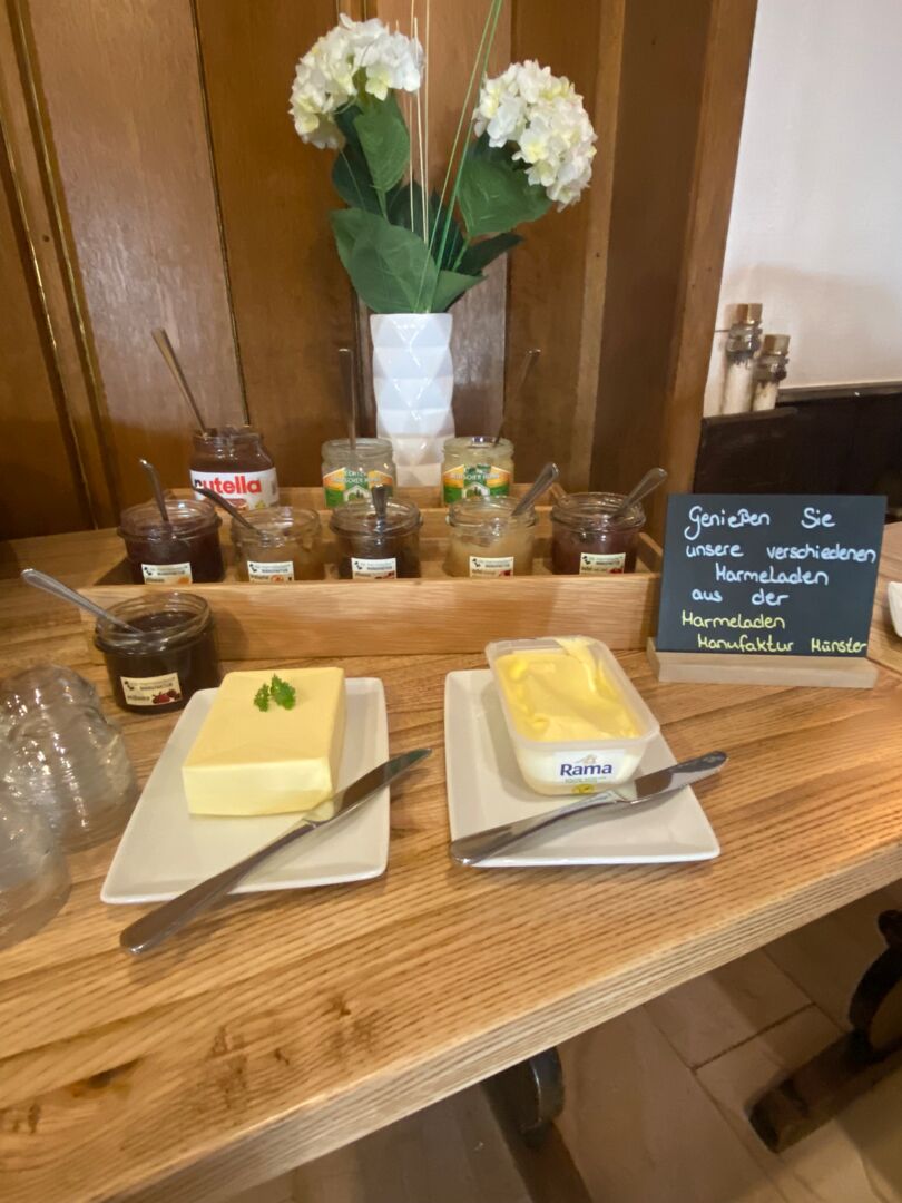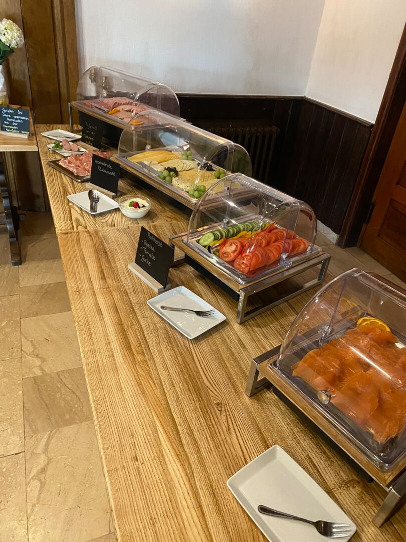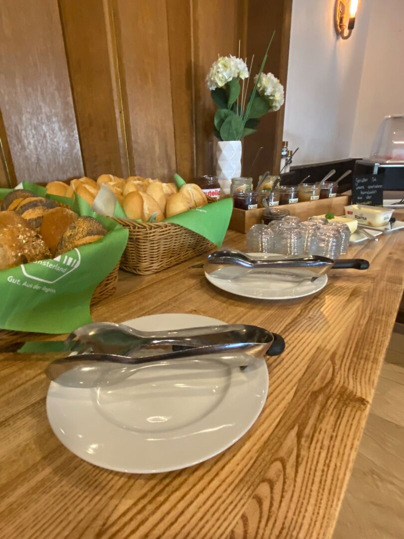 Ganz entspannt in den Tag starten, mit einem herrlichen Blick auf die Werse und einem Frühstück, das keine Wünsche offen lässt. Mit dem Münsterländer Frühstücksbuffet kann man die Heimat schmecken. Das üppige Frühstücksbuffet bietet viele regionale Produkte und Spezialitäten. Die Milchprodukte kommen vom Milchhof Große Kintrup in Münster und dem Auenhof Schulte Bisping aus Telgte. Die Frühstückseier werden von glücklichen Hühnern auf Linderskamp´s Hof in Saerbeck gelegt. Unsere Marmeladen werden mit viel Liebe vom Team der Marmeladen Manufaktur in Münster in Handarbeit eingekocht. Unsere Fleisch- & Wurstwaren beziehen wir von der Feinkostfleischerei Hidding aus Nordwalde! Als einer der wenigen Betriebe mit eigener Schlachtung kommen die Tiere von Höfen direkt aus der Nachbarschaft. Der Münsterland Imker Mike Gerdes bringt die Parklandschaft des Münsterlandes mit Hilfe seiner Bienen ins Glas und auf dem Tisch. Die Backwaren stammen ebenfalls von hiesigen Bäckern. Abgerundet wird das Buffet mit frischem Obst.