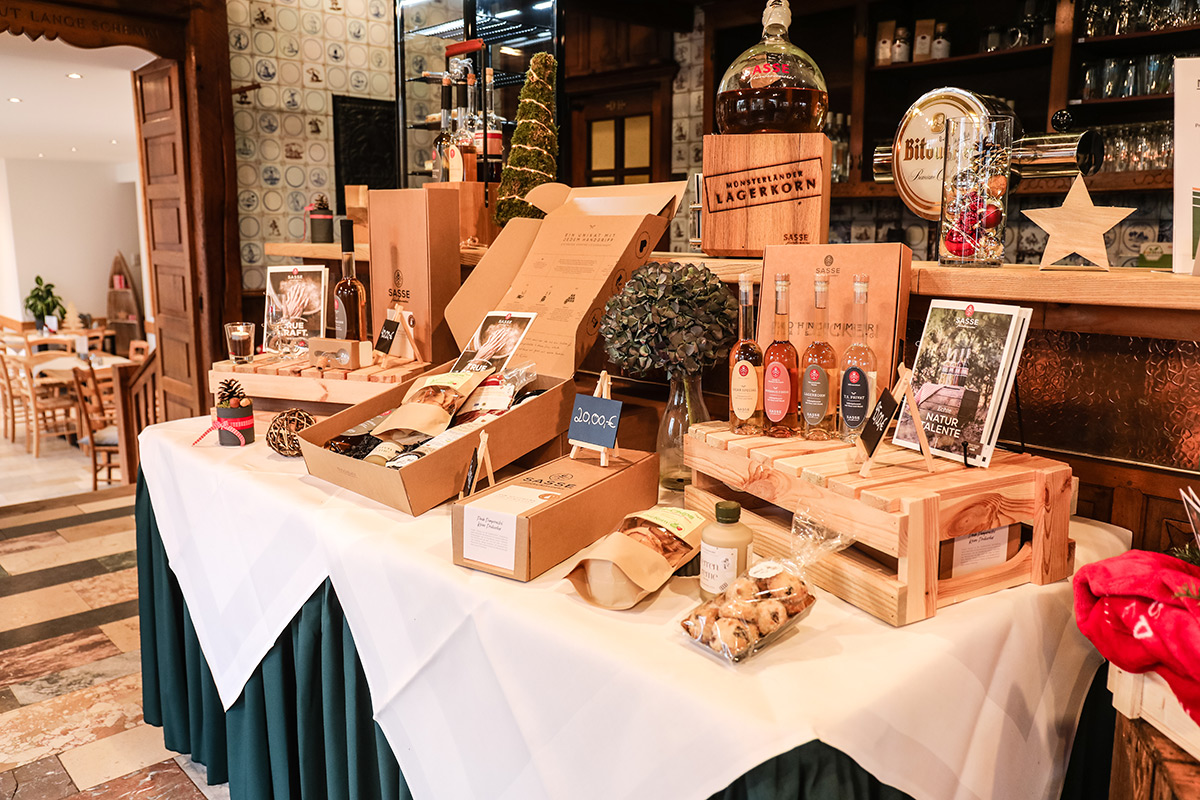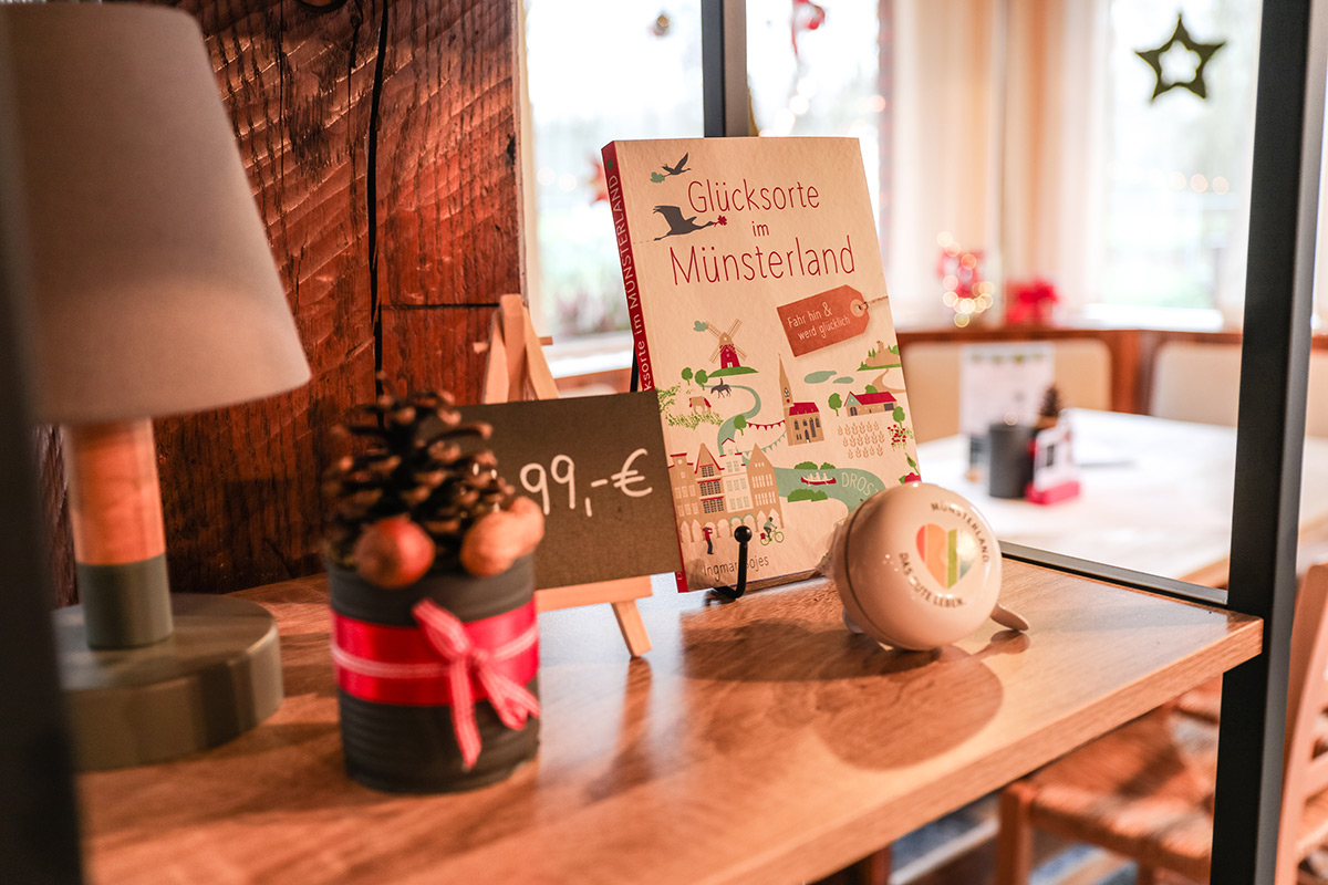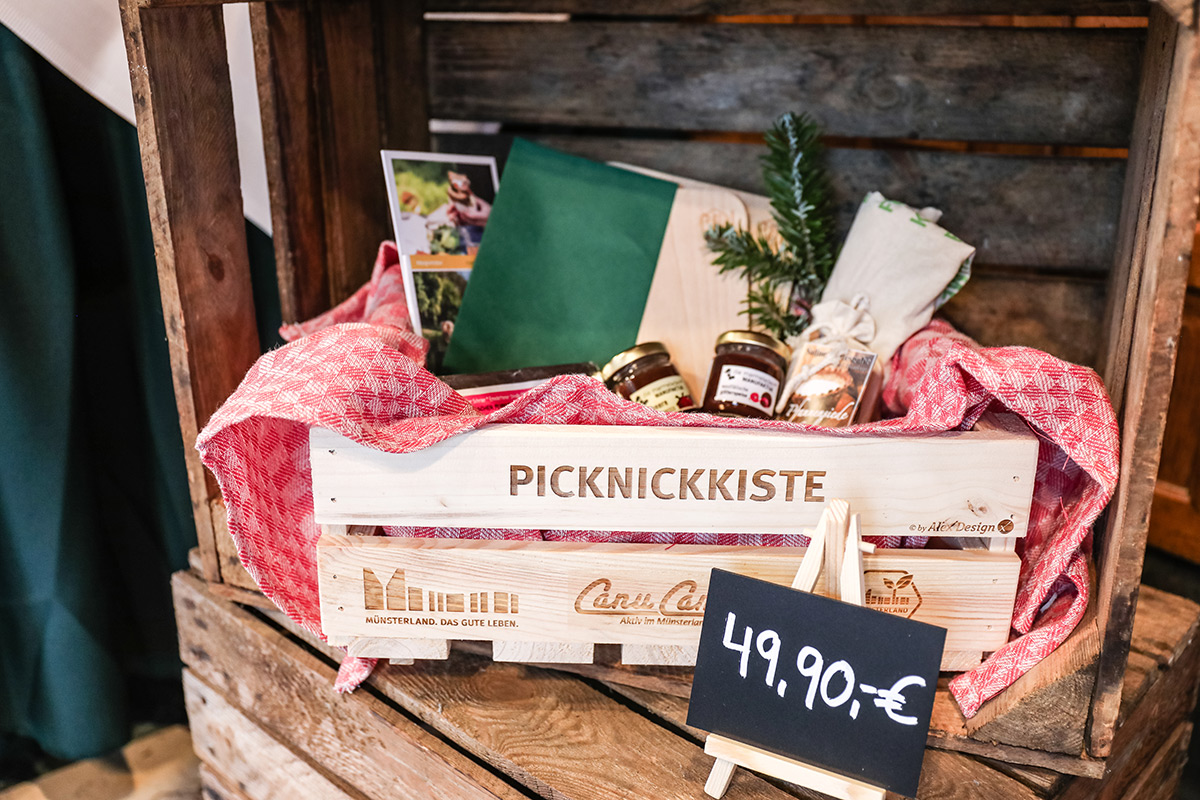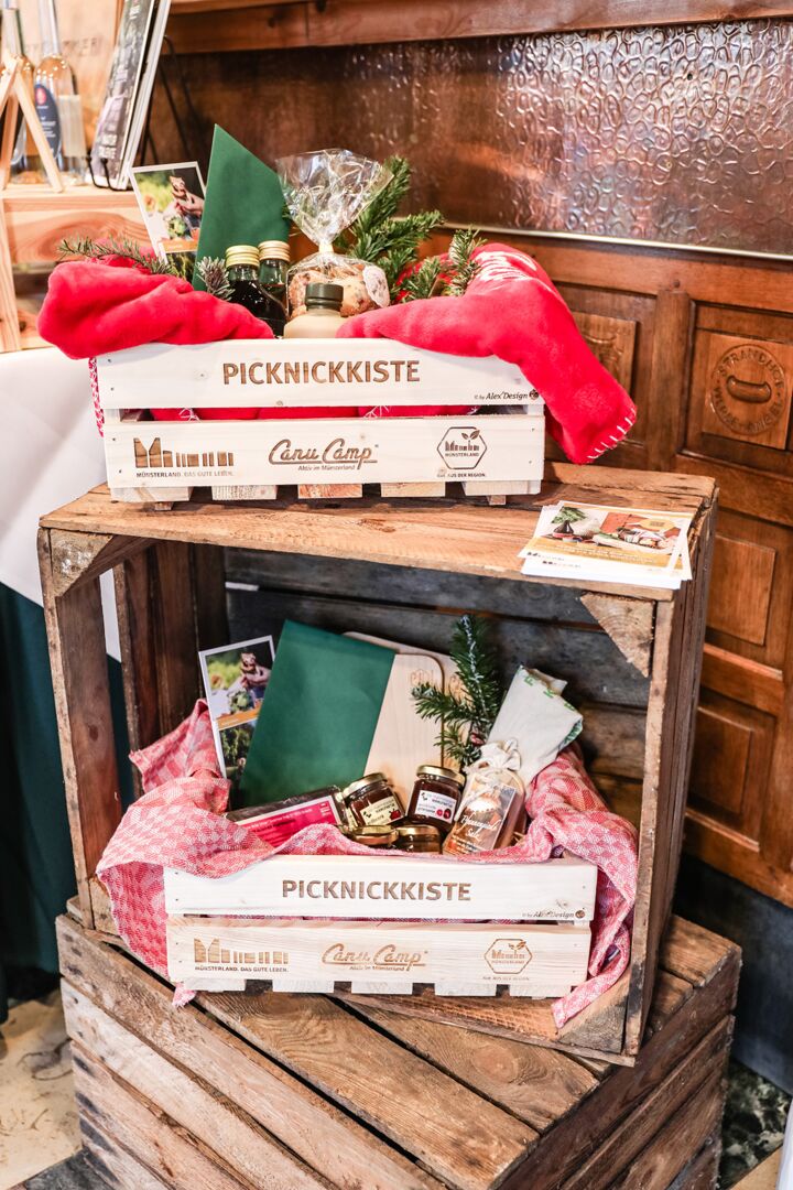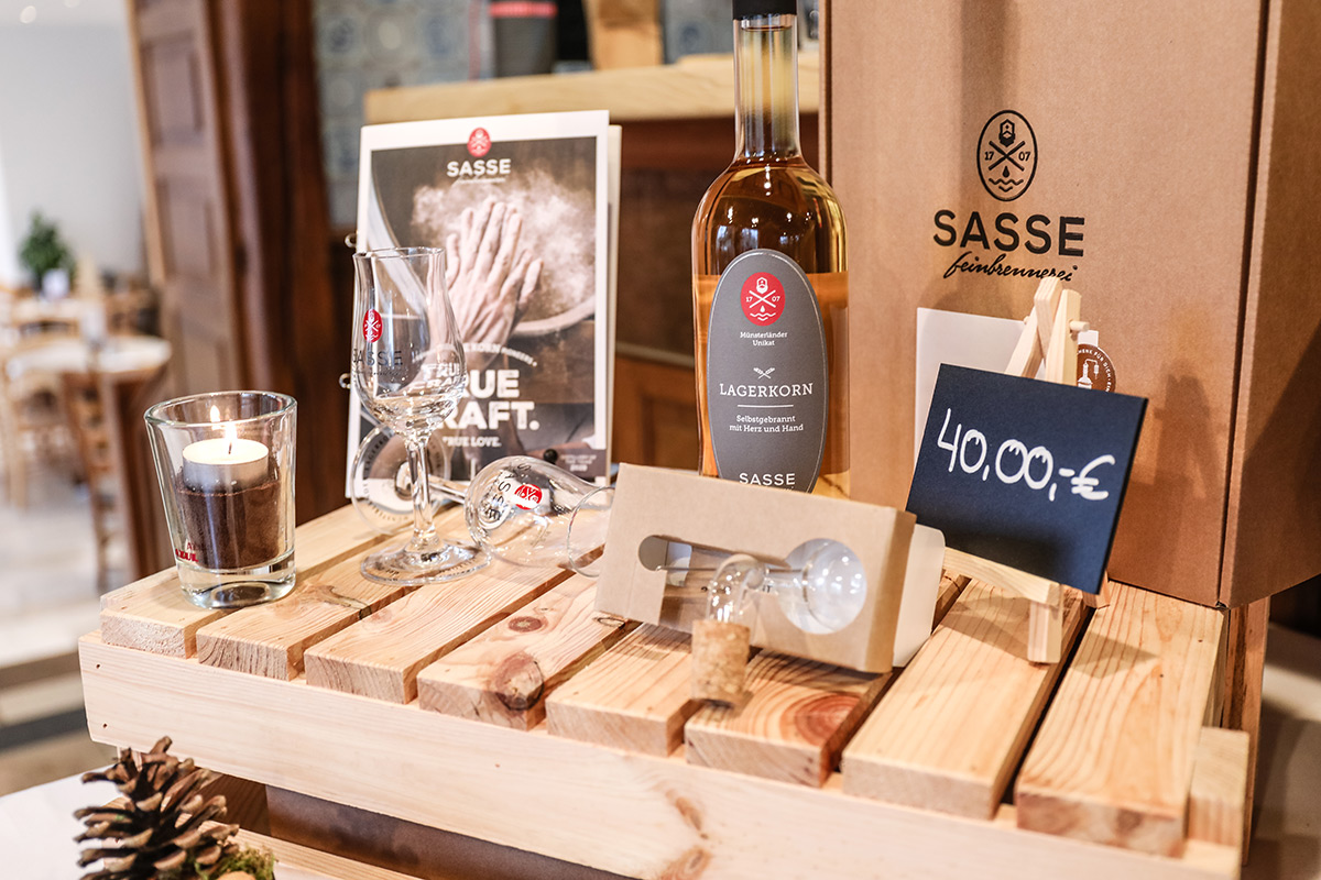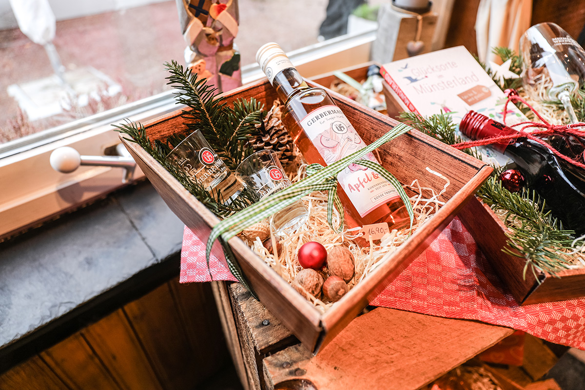 Der Münsterland-Shop oder wie wir ihn gerne nennen » #StrandHofladen «. Der ging natürlich pünktlich zur Vorweihnachtszeit mit allen regionalen Lieblingssachen an den Start. Unsere ländlich-rustikale Präsent-Holzkiste steht zum Befüllen bereit. Und natürliche jede Menge leckerer und nützlicher Input. Sie wählen, wir packen ein und verpacken. Hundertprozentiger können Sie das Münsterland nicht verschenken." Der Mensch liebt Anschaulichkeit, darum lassen wir uns ein paar Dinge vorführen. Die Genussexpertin Paula Pumpernickel hat die Münsterländische Herrencreme in ein fein balanciertes Likör-Getränk aus Schokolade, Vanille und Rum verwandelt. Sasse aus Schöppingen steuert seinen legendären Lagerkorn bei. Die Münstersche Marmeladenfaktur versüßt den Tag durch Feige, Birne, Portwein und andere niederknieenswerte Kompositionen. Vom Obsthof Korn liegen Apfelchips bei. Undsoweiter, sagen wir an dieser Stelle, denn der Appetit ist längst geweckt und die Liste wäre lang.