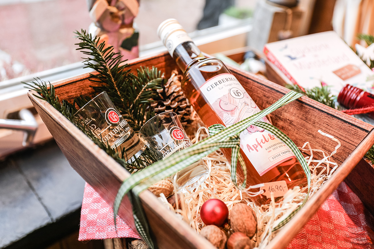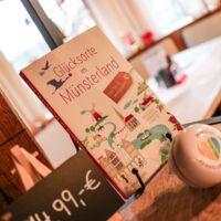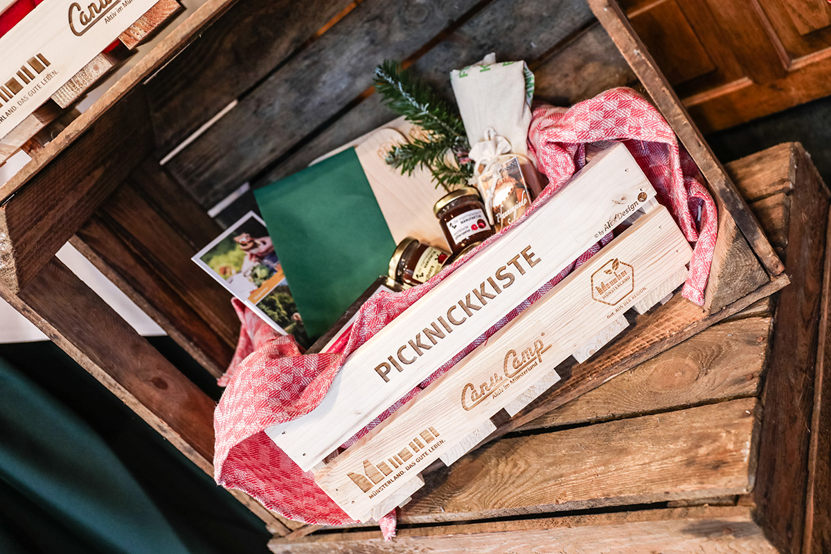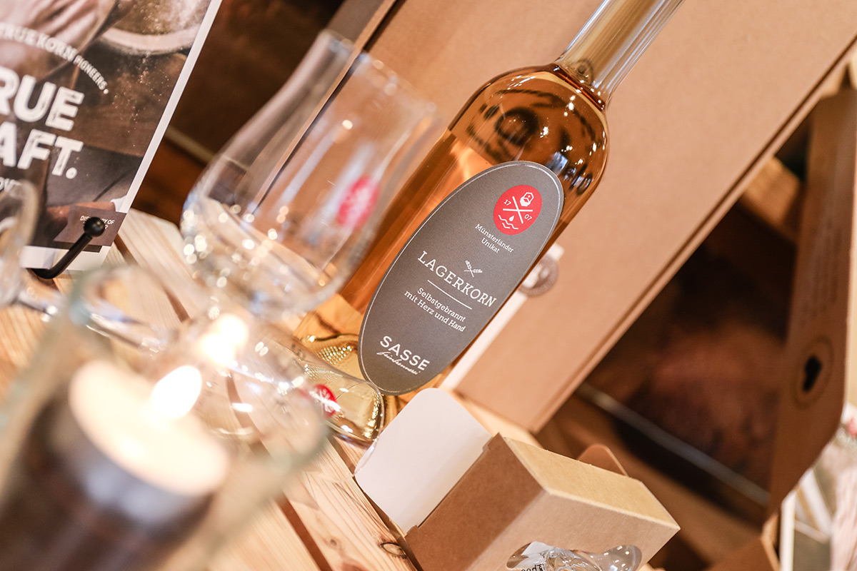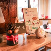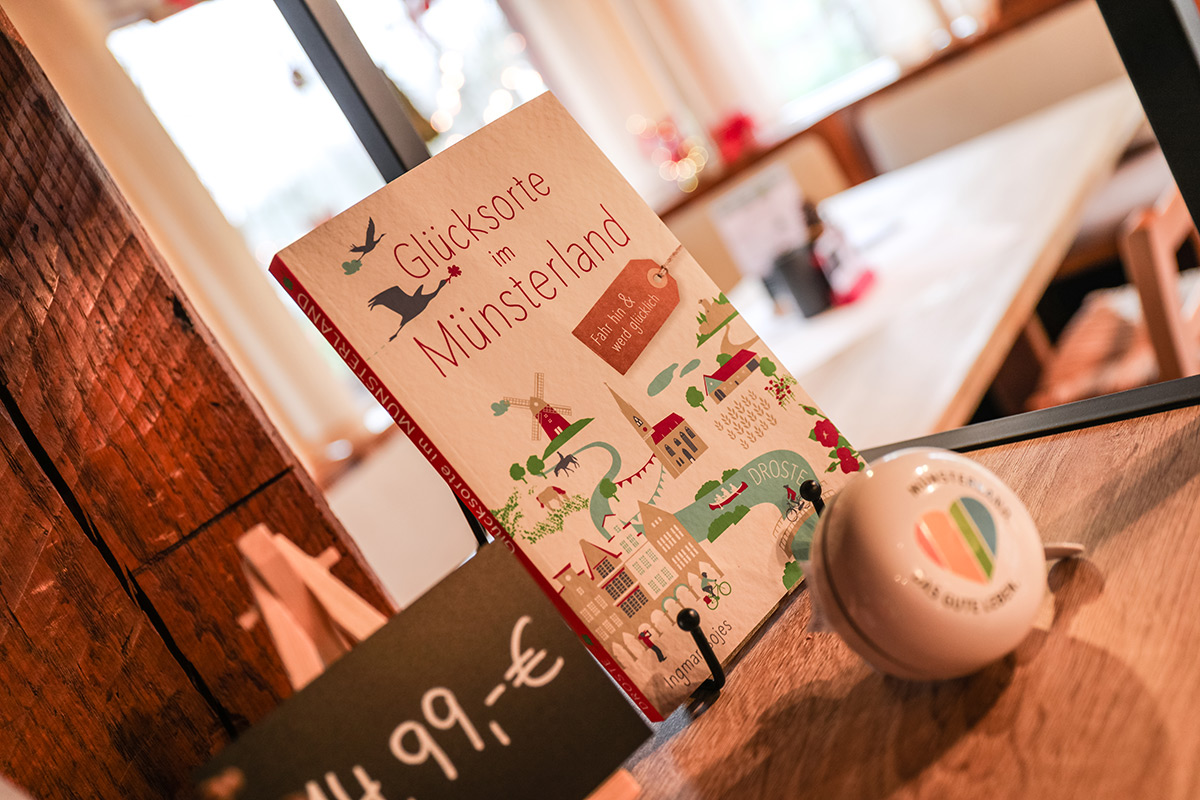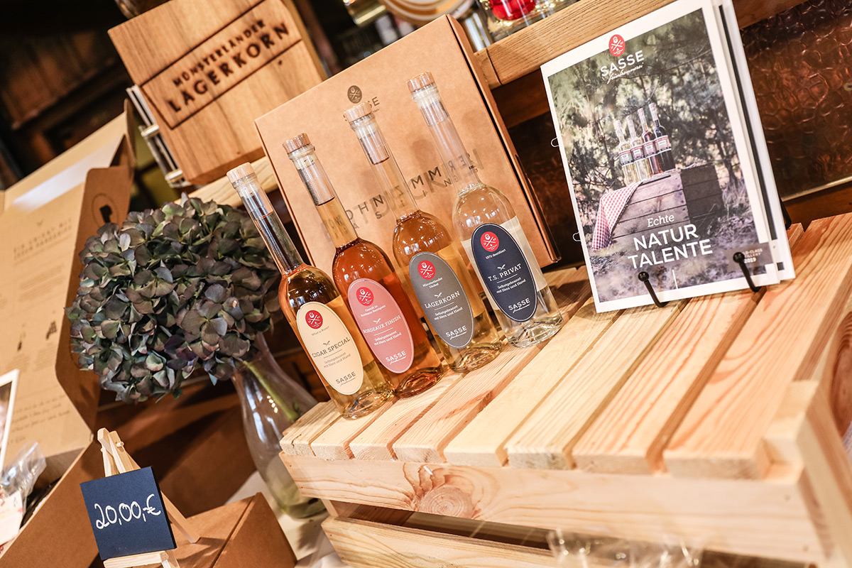 Der Münsterland-Shop oder wie wir ihn gerne nennen » #StrandHofladen «. Der ging natürlich pünktlich zur Vorweihnachtszeit mit allen regionalen Lieblingssachen an den Start. Unsere ländlich-rustikale Präsent-Holzkiste steht zum Befüllen bereit. Und natürliche jede Menge leckerer und nützlicher Input. Sie wählen, wir packen ein und verpacken. Hundertprozentiger können Sie das Münsterland nicht verschenken." Der Mensch liebt Anschaulichkeit, darum lassen wir uns ein paar Dinge vorführen. Die Genussexpertin Paula Pumpernickel hat die Münsterländische Herrencreme in ein fein balanciertes Likör-Getränk aus Schokolade, Vanille und Rum verwandelt. Sasse aus Schöppingen steuert seinen legendären Lagerkorn bei. Die Münstersche Marmeladenfaktur versüßt den Tag durch Feige, Birne, Portwein und andere niederknieenswerte Kompositionen. Vom Obsthof Korn liegen Apfelchips bei. Undsoweiter, sagen wir an dieser Stelle, denn der Appetit ist längst geweckt und die Liste wäre lang.