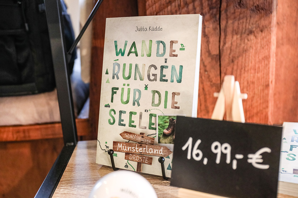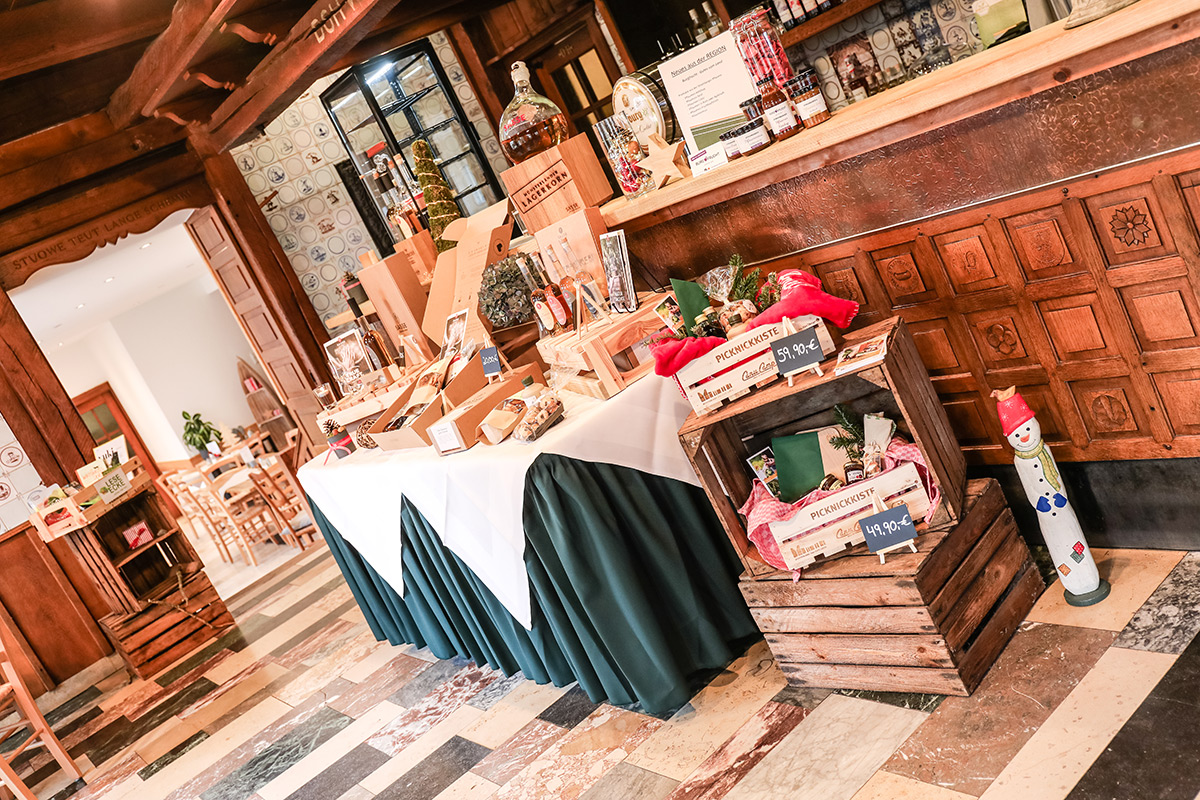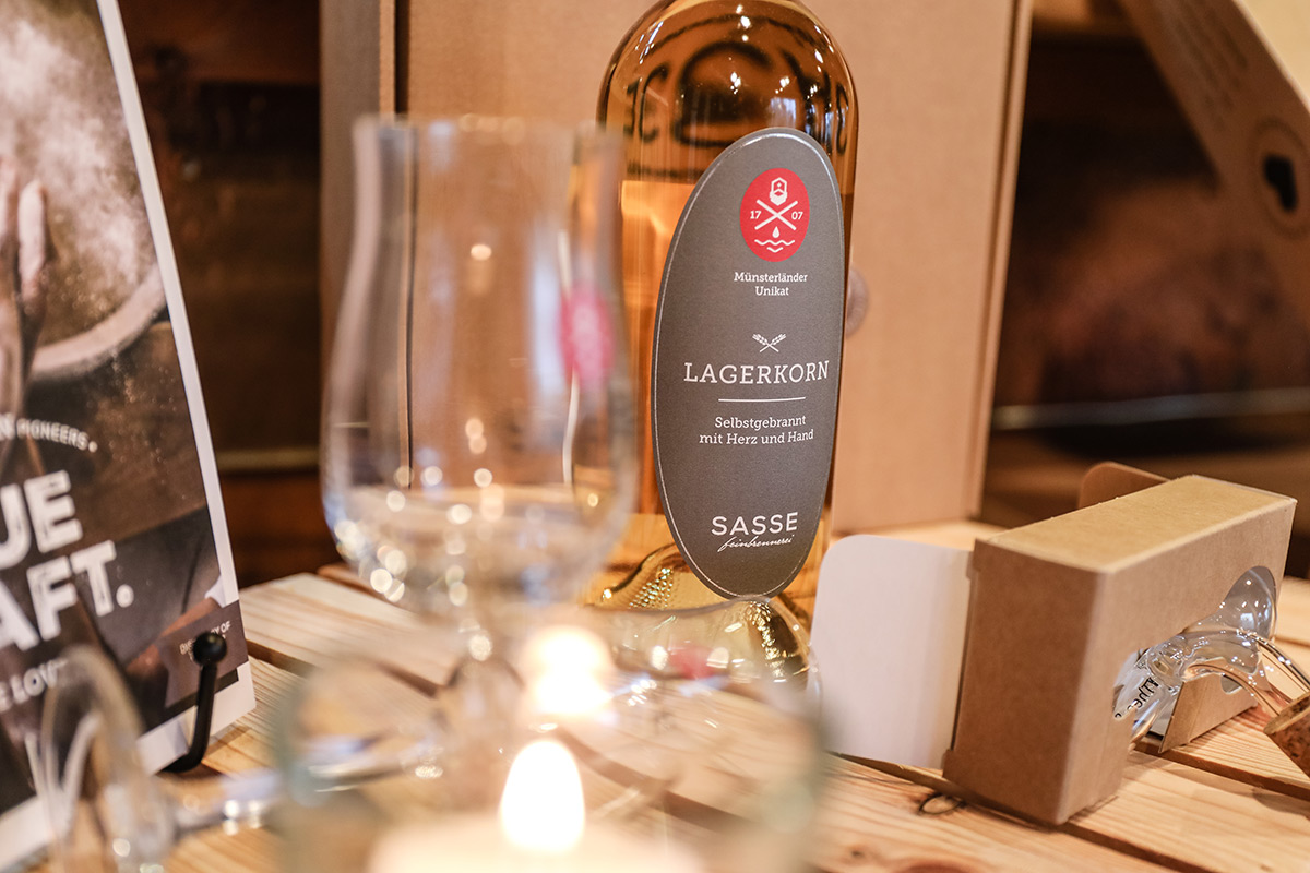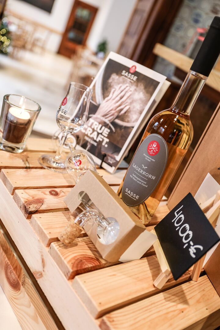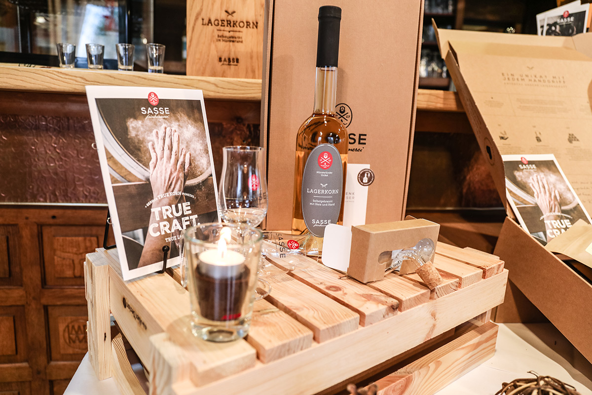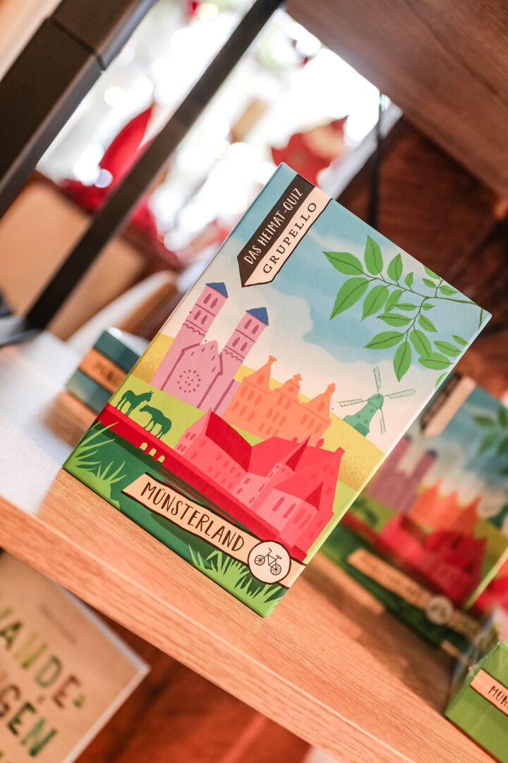 Der Münsterland-Shop oder wie wir ihn gerne nennen » #StrandHofladen «. Der ging natürlich pünktlich zur Vorweihnachtszeit mit allen regionalen Lieblingssachen an den Start. Unsere ländlich-rustikale Präsent-Holzkiste steht zum Befüllen bereit. Und natürliche jede Menge leckerer und nützlicher Input. Sie wählen, wir packen ein und verpacken. Hundertprozentiger können Sie das Münsterland nicht verschenken." Der Mensch liebt Anschaulichkeit, darum lassen wir uns ein paar Dinge vorführen. Die Genussexpertin Paula Pumpernickel hat die Münsterländische Herrencreme in ein fein balanciertes Likör-Getränk aus Schokolade, Vanille und Rum verwandelt. Sasse aus Schöppingen steuert seinen legendären Lagerkorn bei. Die Münstersche Marmeladenfaktur versüßt den Tag durch Feige, Birne, Portwein und andere niederknieenswerte Kompositionen. Vom Obsthof Korn liegen Apfelchips bei. Undsoweiter, sagen wir an dieser Stelle, denn der Appetit ist längst geweckt und die Liste wäre lang.